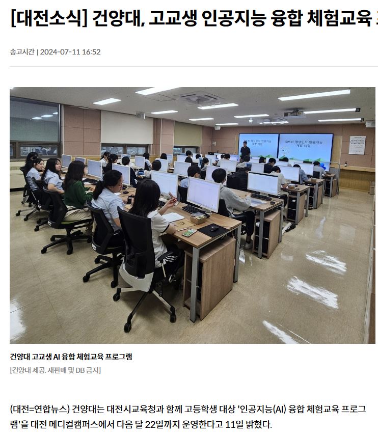 『 건양대 고교생 인공지능융합체험 교육 프로그램 진행 』글의 상세내용을 확인하는 표로 제목, 부서명, 등록일, 조회, 첨부, 내용으로 나뉘어 설명합니다.