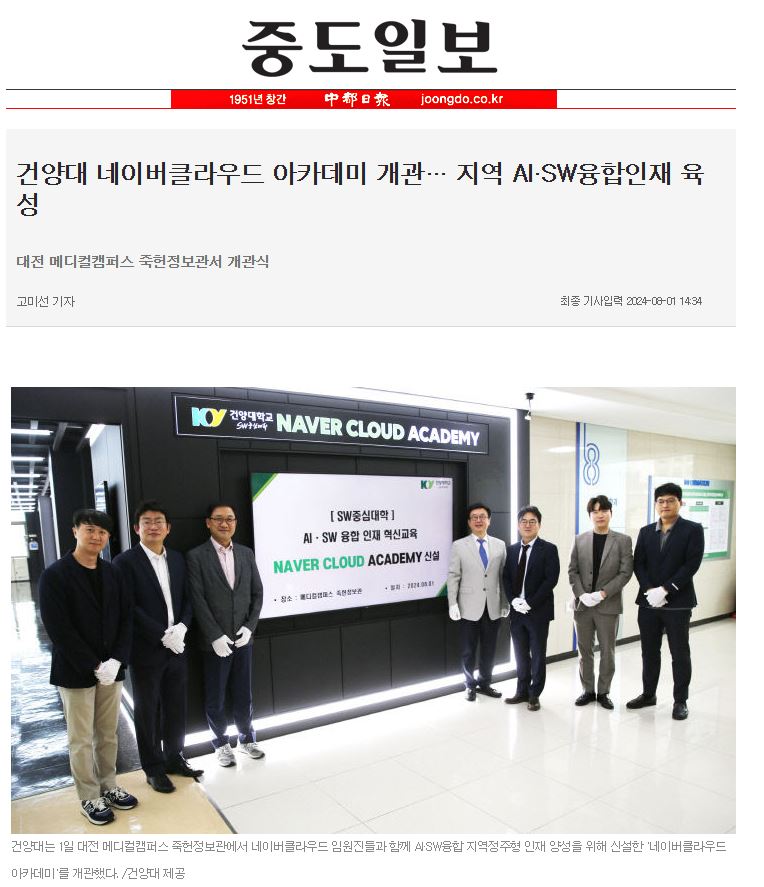 『 건양대 네이버클라우드 아카데미 개관 』글의 상세내용을 확인하는 표로 제목, 부서명, 등록일, 조회, 첨부, 내용으로 나뉘어 설명합니다.